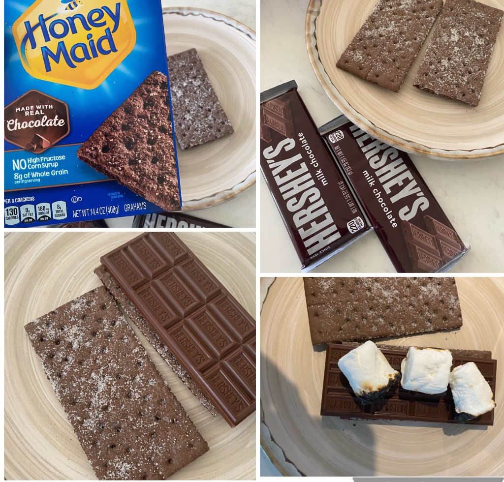- Place a graham slice on the plate. Top it with a bar of Hershey’s.
