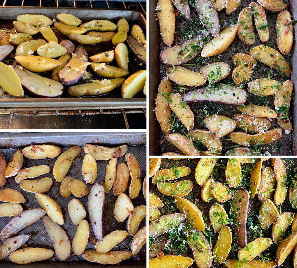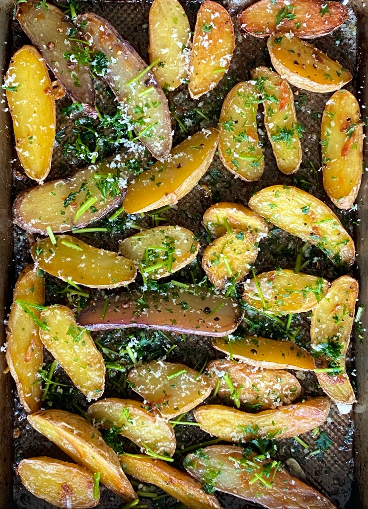 - Cook in the oven for 35- 40 mins or so till the potatoes are golden and done. Turn the potatoes halfway through the cooking.