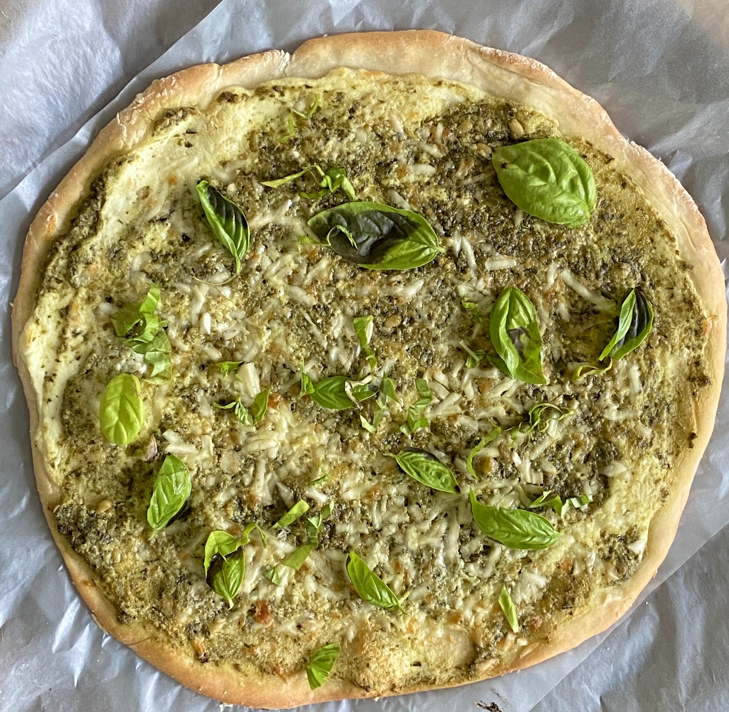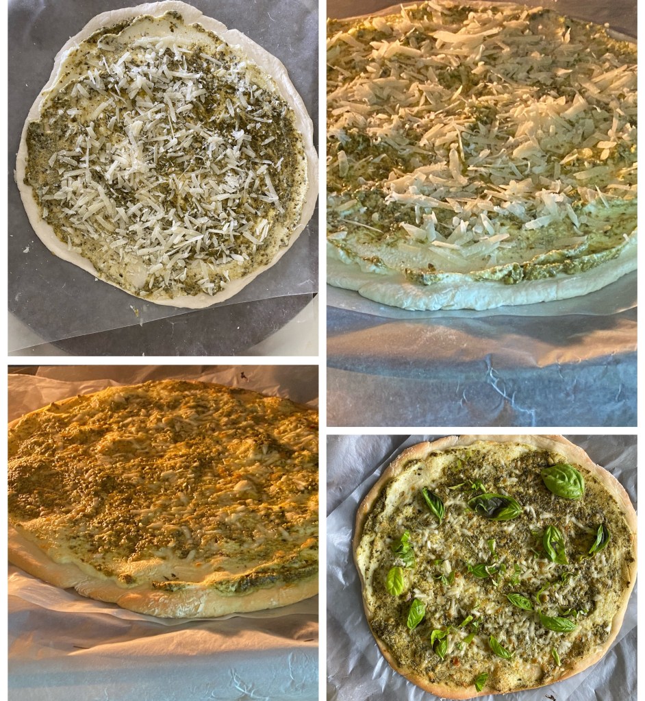 - Add the ricotta cheese on the dough. Top that with pesto. Sprinkle pecorino Romano on the pizza dough.