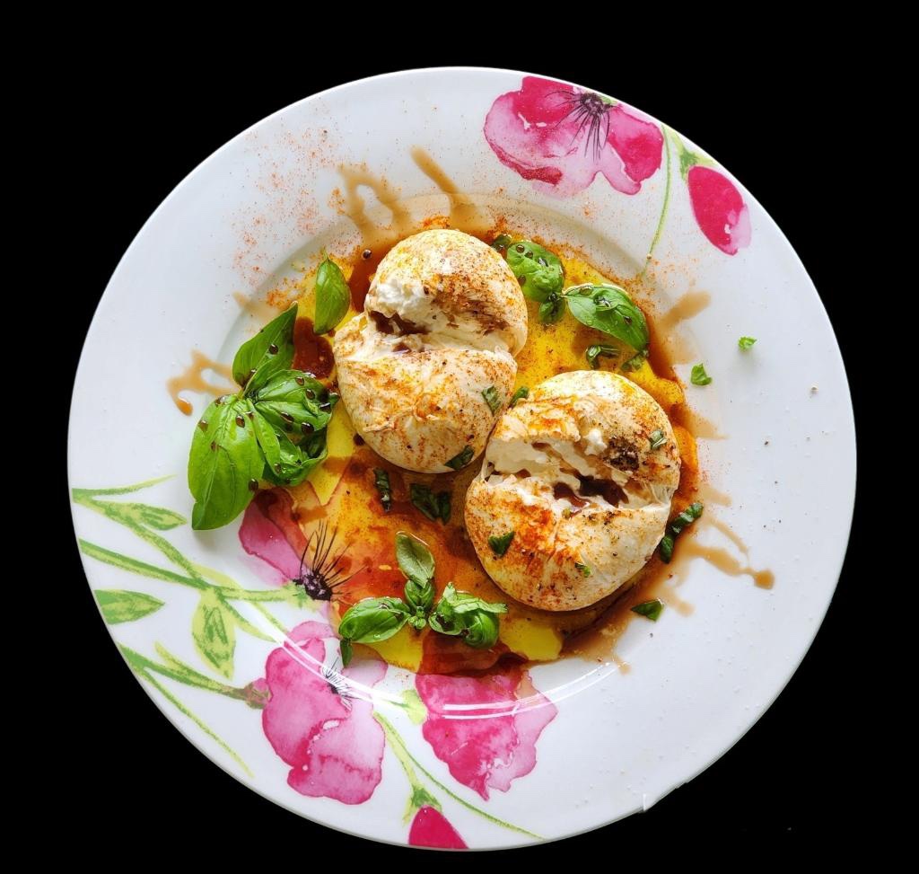 - Place Burrata on a serving plate. Gently slice open the Burrata. Season with salt, sugar, pepper, smoked paprika.