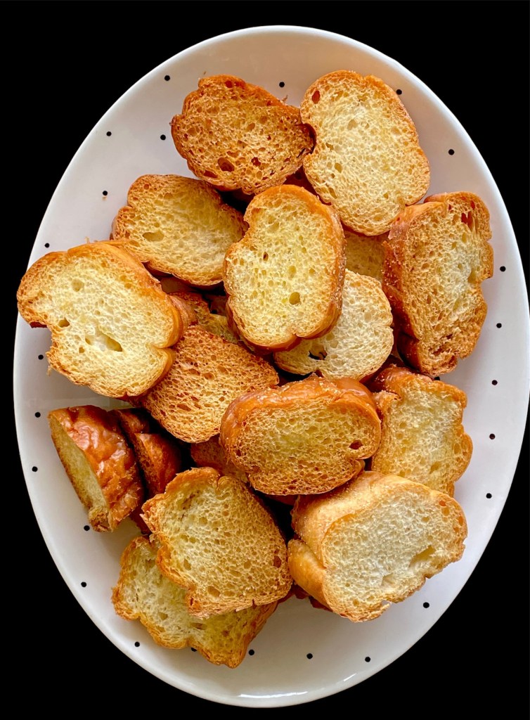 - Place the bread rounds on a baking tray. Drizzle olive oil generously. Bake for 10-12 mins till golden and crunchy.