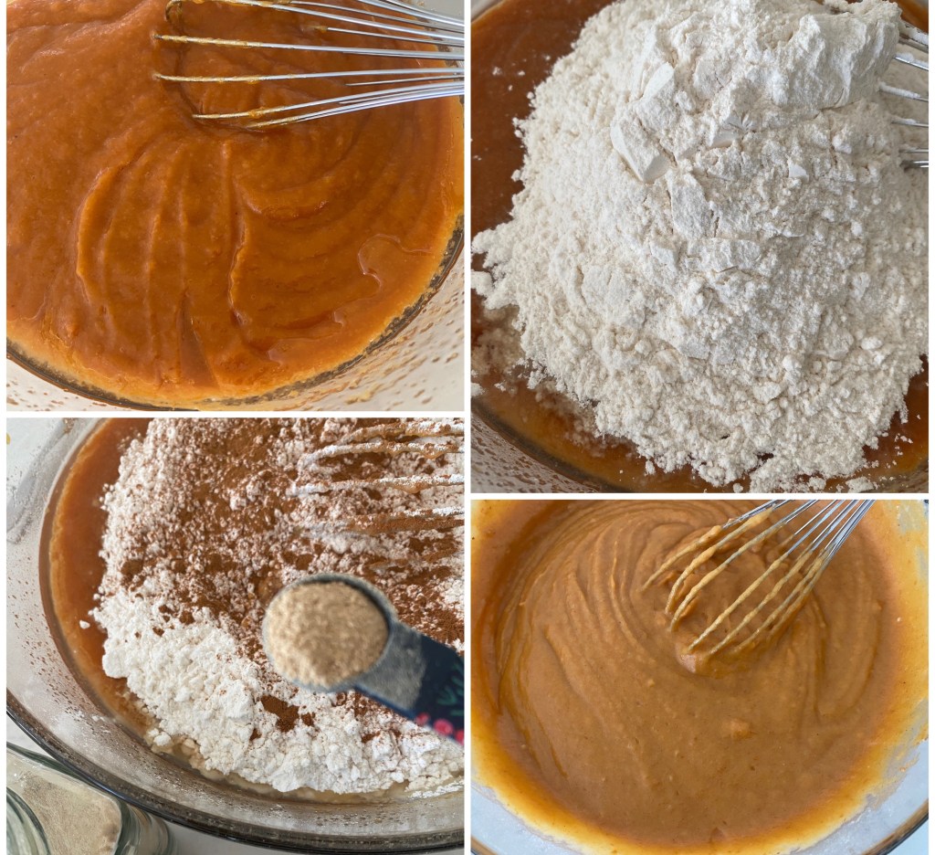 - In a large bowl add pumpkin pie mix. Add the two eggs, oil and granulated sugar. Mix with a whisk to combine to a smooth consistency.