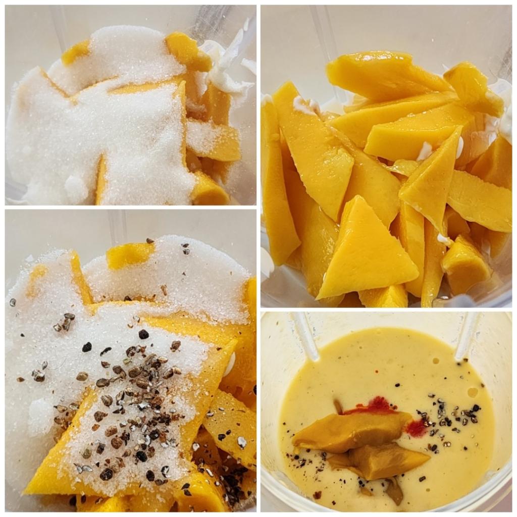 - In a blender, add the cubed mango, Greek yogurt, milk, sugar, cardamom, the saffron water and a handful of ice cubes.