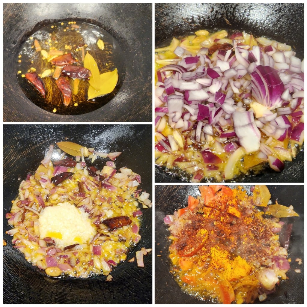- In the remaining oil add dry red chilies, bay leaf, cumin seeds, green cardamom, cloves and cinnamon. Cook for a few seconds.