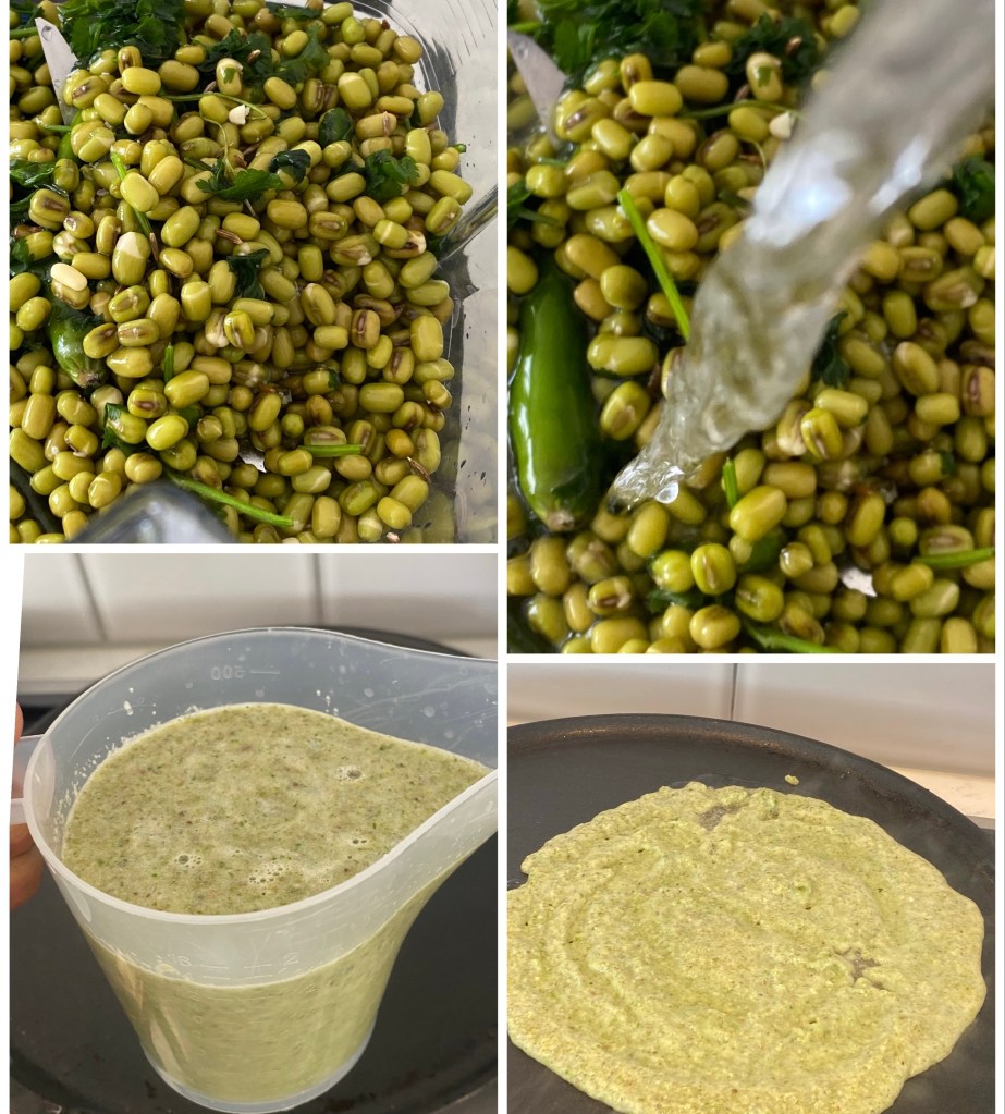 - In a blender, grind the rice and green gram mixture with salt, green chillies, asafetida, coriander leaves, and ginger, adding a little water at a time until you have a smooth batter texture. Add the cumin seeds to the batter. Mix.