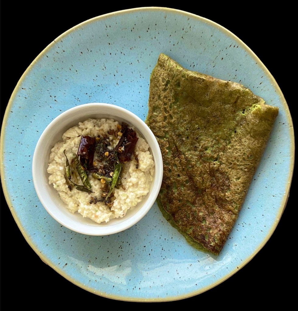 Pesarattu is a delectable South Indian delicacy made from green gram or mung beans that has its origins in Andhra Pradesh, India. This savory crepe-like dish is golden-brown, almost green in color with a crispy texture on the outside and soft on the inside. Soaked green gram (mung beans) are blended together into a batter with ginger, green chili, and other spices that add a delightful aroma and flavor to the dish. The dish is wonderfully balanced in seasoning, and the lightness of the crepe makes it the perfect breakfast item. Who says healthy food needs to be boring? If you are looking to indulge in something healthy yet oh so delicious, this popular, nutritious breakfast dish is your go to recipe. This dish is gluten-free, vegan and high protein, high fiber, and rich in iron. It is surprisingly a low fat meal as no ghee is used and only minimal oil is used to cook it in the pan. It is a perfect vegetarian meal for everyone. Making Pesarattu at home is really an easy process that requires only a few ingredients and minimal effort. This dish is a great way to start your day, providing an option that is both delicious and satisfying. I had this dish for the first time in 2008 at a friend’s house- a friend who had superb culinary skills and could make traditional South Indian dishes like it was the easiest thing in the world. I never got round to asking her for the recipe, but I remember the taste so well that I had to recreate this in my kitchen. Did I tell you about my love for South Indian food? I reckon I have! @sarchakra