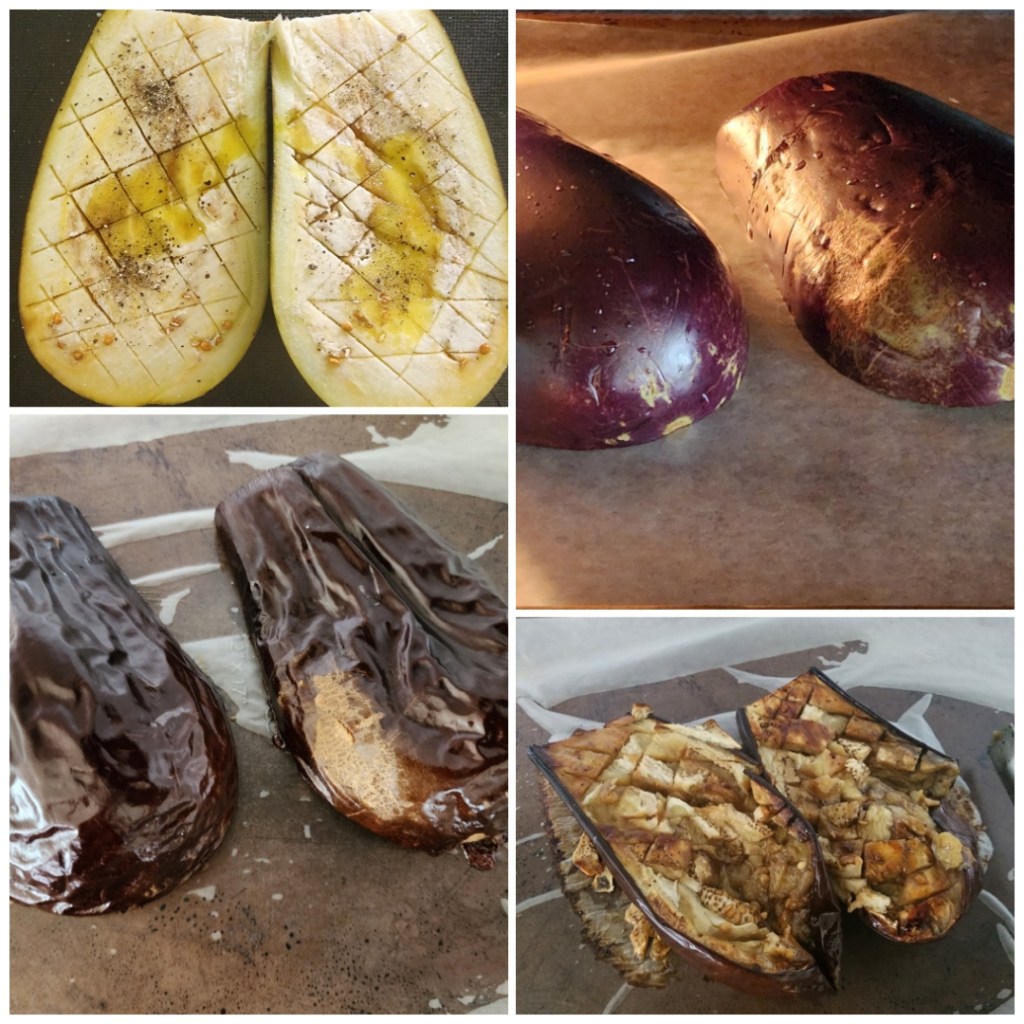 - Preheat the oven to 375°F. Cut the eggplant in half. Use a sharp knife and criss cross the flesh of the eggplants all over. Place the eggplant halves skin side up on a baking sheet lined with parchment paper.