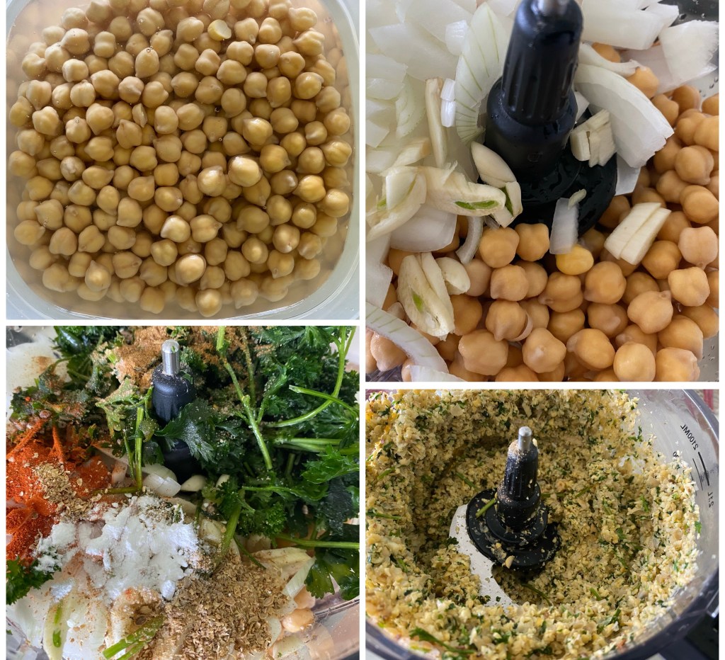 • In a food processor add the drained and rinsed chick peas, onion, garlic, coriander leaf, parsley, salt, black pepper, toasted cumin powder, coriander powder and smoked paprika. Blitz till the mixture comes together and you can take portions of it and bind it.
