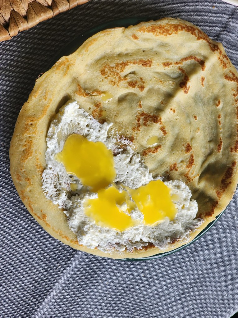 - Spoon a dollop of lemon curd onto one half of the crepe.