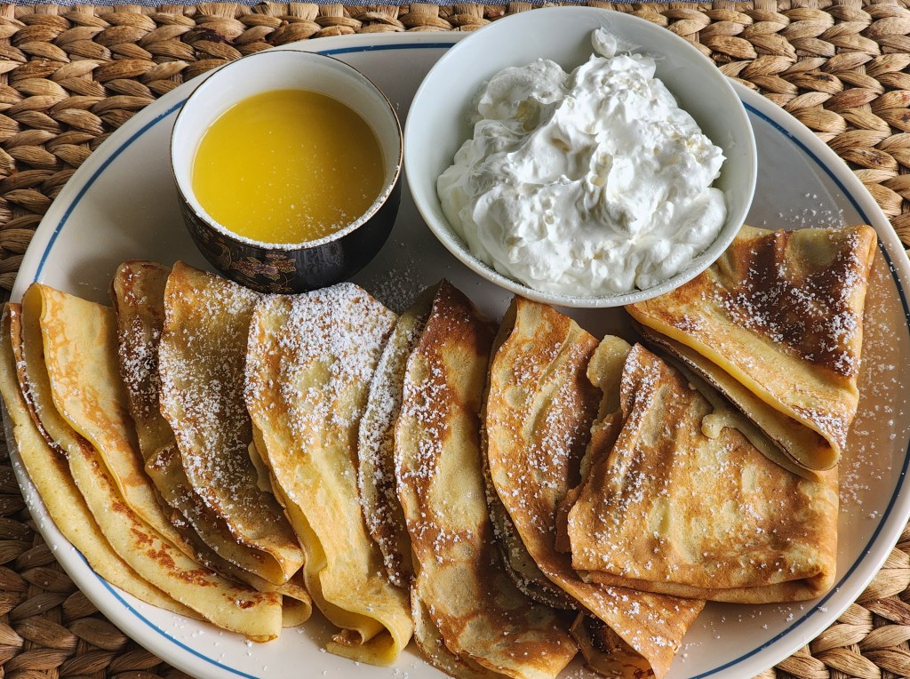 Crêpes de Froment (wheat flour pancakes) are thin, delicate pancakes made from wheat flour, eggs, and milk, usually served with a variety of sweet or savory fillings. Similar to Dutch poffertjes (fluffy pancakes with yeast and buckwheat flour), Indian dosas (fermented ground black lentils and rice), Russian blini (bite sized pancakes), Japanese hirayachi (thin savory pncakes) and Chinese jianbing (mung bean flour pancakes), crepes are a versatile and delicious dish.The history of this dish is complex and fascinating, involving centuries of development and adaptation to different cultural traditions. It is a favorite breakfast, brunch, or dessert option for many. The origins of the crepe can be traced back to the ancient Roman Empire, where a similar dish called ‘scriblitum’ was popular. This dish was made from a wheat flour batter, and it was cooked on a hot griddle. It was then served with honey or various sweet toppings. Over time, the dish spread throughout Europe, becoming popular in France in the 12th century in the French region of Brittany. They were then known as Galettes de Sarrasin (buckwheat pancakes) and made with buckwheat flour. They were a staple food of the working class and were often served with a variety of savory fillings like ham, cheese, and eggs. ‘Crepe’ comes from the French word ‘crêpe,’ which means ‘to curl.’ This name reflects the thin, delicate nature of these pancakes, which are so thin that they curl up and create a beautiful spiral as they cook. Over time, crepes became more popular and spread throughout France, with sweet fillings like chocolate, fruits, and whipped cream becoming more common. Vendors adapted this street food to include local ingredients and flavors, selling both sweet and savory varieties. Some of the beloved sweet fillings include Nutella, strawberries, sweet jams and whipped cream, while savory options included spinach, ham, mushrooms, cheese and vegetables. Today, crepes are enjoyed all over the world, with different cultures putting their own spin on this classic dish. In America, for example, crepes are often served with a fruit compote, cream, and powdered sugar. In Japan, crepes are often filled with ice cream, fruit, and whipped cream, creating a fun and indulgent dessert treat. Try this recipe today I hope you get to appreciate the delicate texture and rich, satisfying flavors. The possibilities are endless, and you are sure to find a flavor combination that you love.