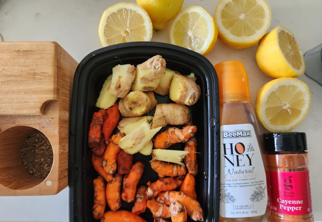 - In a blender, combine the raw turmeric, root ginger, black pepper, lemon juice, and filtered water.