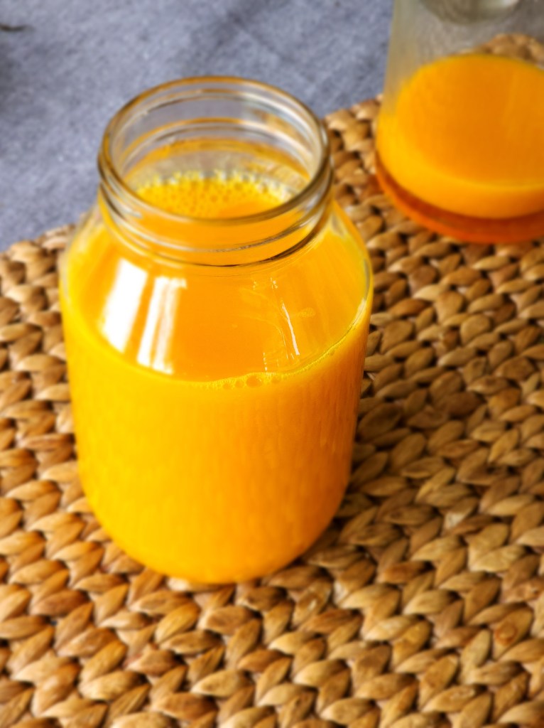 Fair warning: turmeric stains everything so use caution if you have light colored counter tops like mine. In case of any spilling, make a thick paste of baking soda with water, lather it thick and let sit for 15 mins. Wipe away and any stain will be gone! Needless to say, I learnt this the hard way.