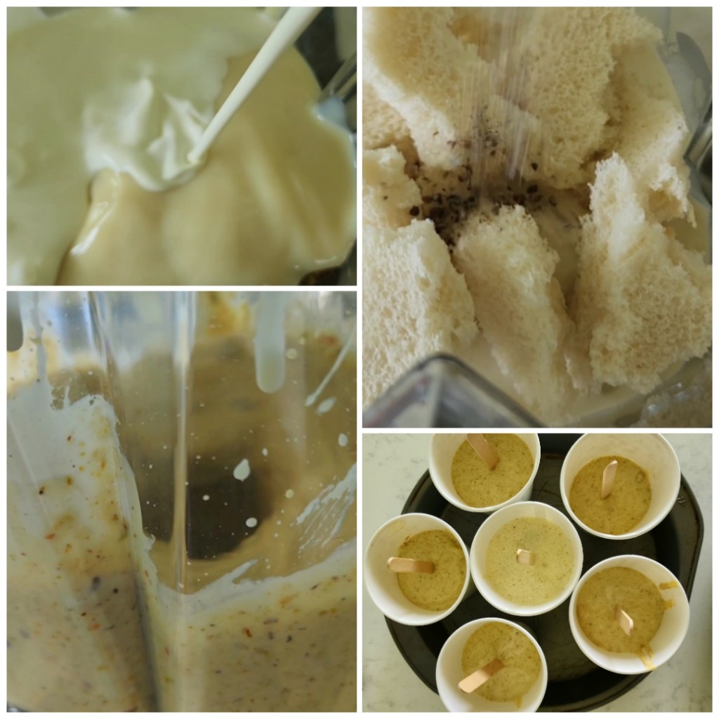 - In a large mixing bowl, pour the heavy whipping cream, condensed milk, torn white bread pieces and ground green cardamom. Pulse until the mixture is smooth and well combined.