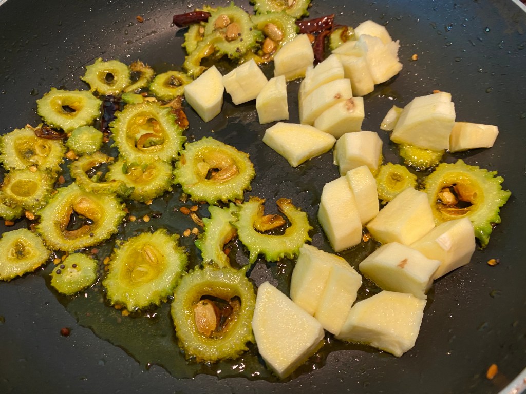 - Add the bitter gourd slices and mustard seeds. Cook for a couple of minutes till lightly golden.