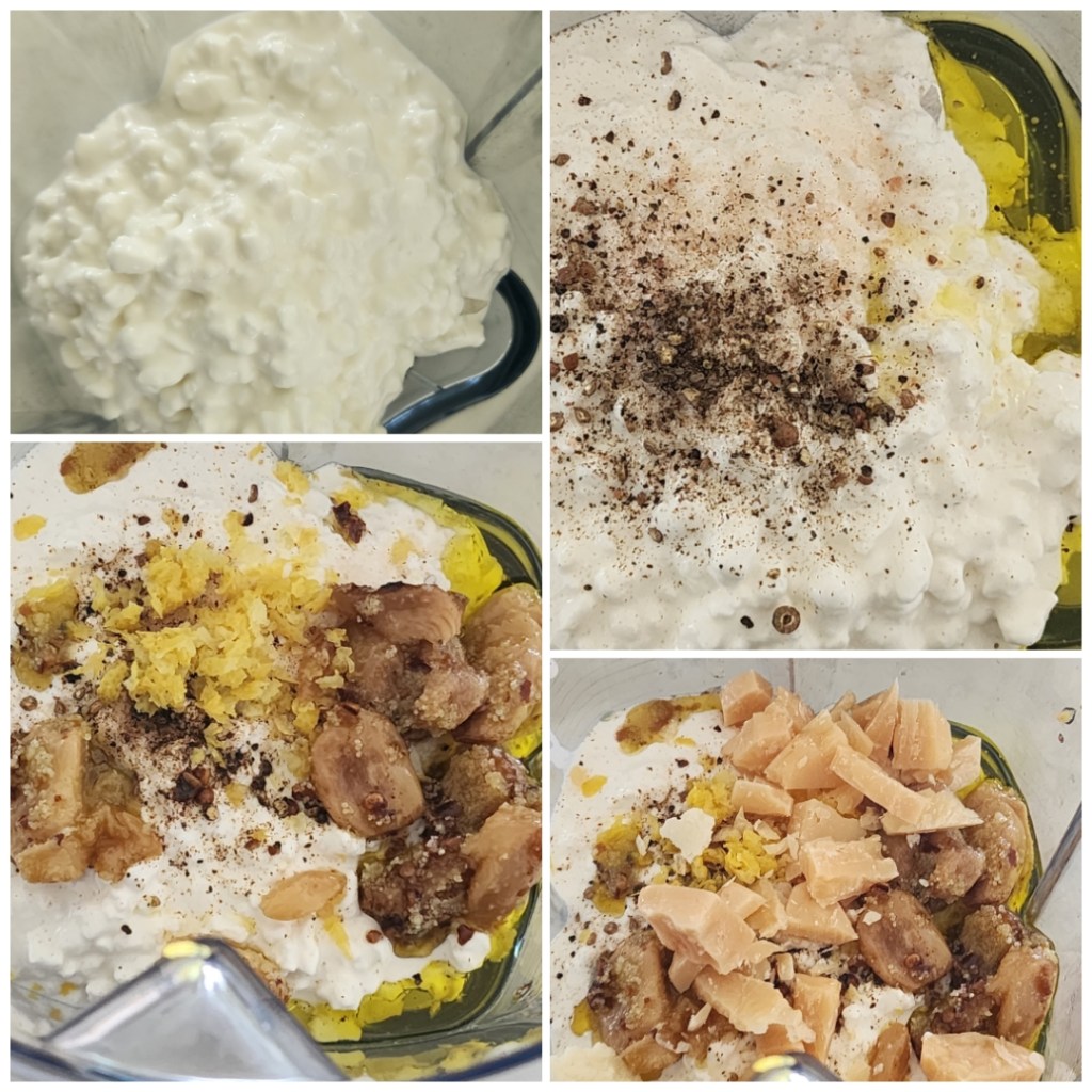 - In the Vitamix add the pasta water, cottage cheese, salt, pepper, lemon zest, garlic confit, Parmesan and olive oil. Blitz for a few seconds till smooth.