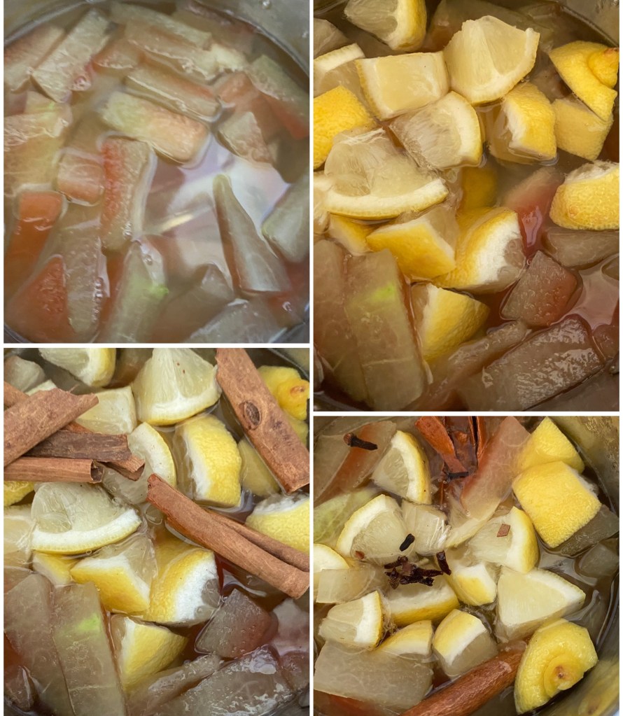 - Add sugar to the simmering water. Let the sugar melt before adding lemon cubes, cloves and cinnamon sticks. Add the watermelon rinds back onto the water.
