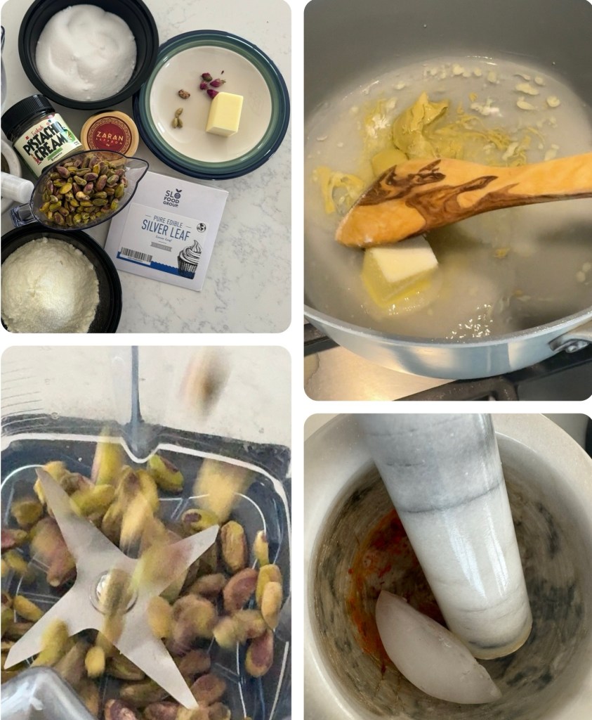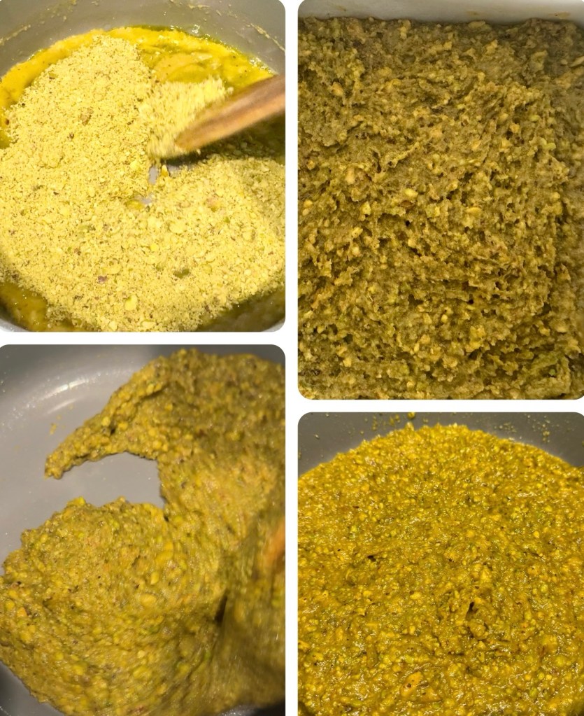 The word ‘barfi’ derives from the Persian word ‘barf’, meaning ‘snow,’ referring to the dessert’s delicate, melt-in-the-mouth texture. Pistachio Barfi is a traditional Indian sweet that holds a cherished place in South Asian cuisine. Originating in India, barfi is associated with festive celebrations, religious ceremonies, and joyful family gatherings, where sweets symbolize prosperity, peace and happiness. Historically, barfi evolved from milk-based sweets, a staple in Indian cuisine for centuries. When nuts like pistachios were introduced into barfi recipes, they added a distinct richness and vibrant green color. The addition of cardamom and saffron, spices with deep roots in Indian history and culture, further makes it a luxurious dessert often enjoyed during Diwali, weddings, and other special occasions. Today, pistachio barfi is beloved not only in India but worldwide. There are so many versions of making Pistachio Barfi . I came across this idea of using pistachio cream or paste from a fellow food blogger. If you don’t have pistachio cream, you can still do this without it @sarchakra