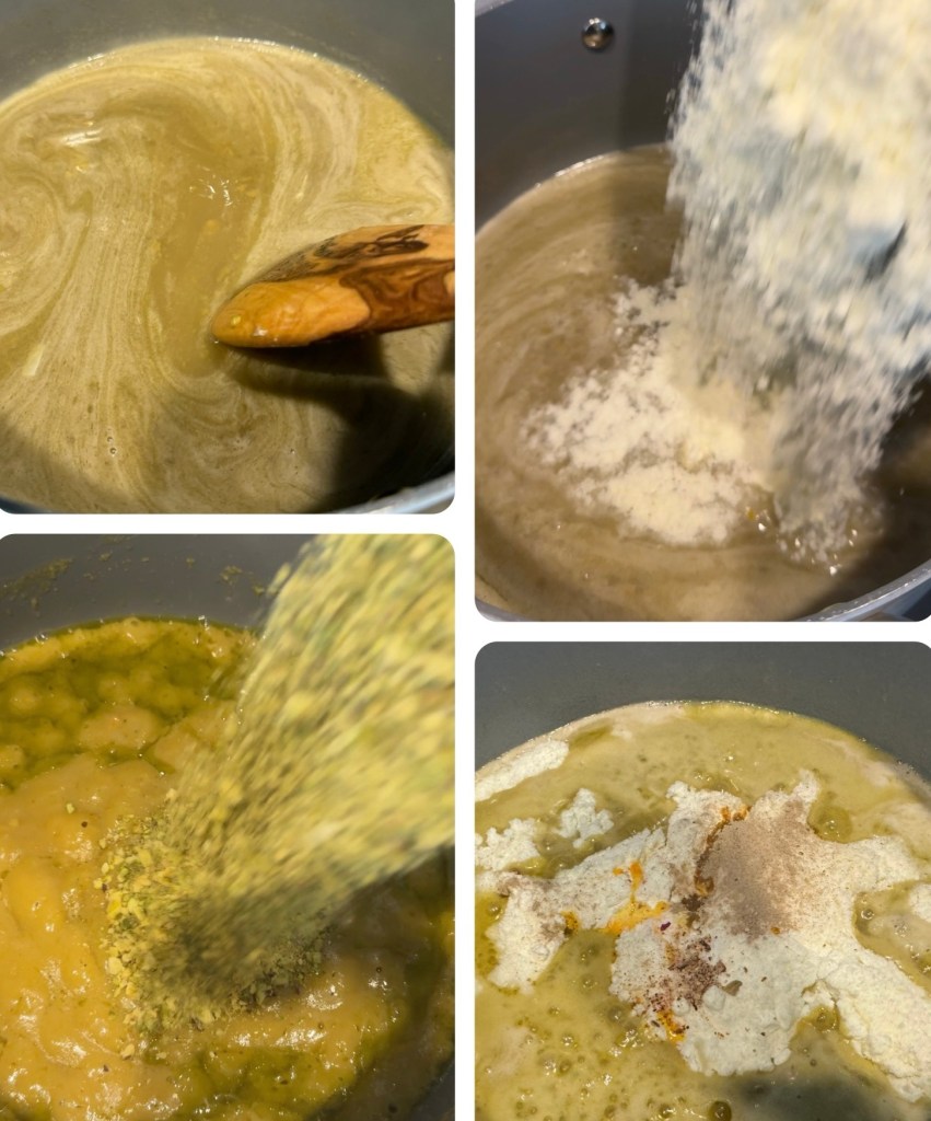 - Add the pistachio powder, pistachio cream, and 2 tbsp of butter to the syrup, stirring continuously. Cook on low heat, stirring constantly to avoid lumps.