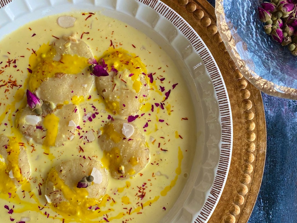 The Ras traditionally takes a long time to make with boiling and reducing milk with sugar, saffron and cardamom. This is a shortcut method.