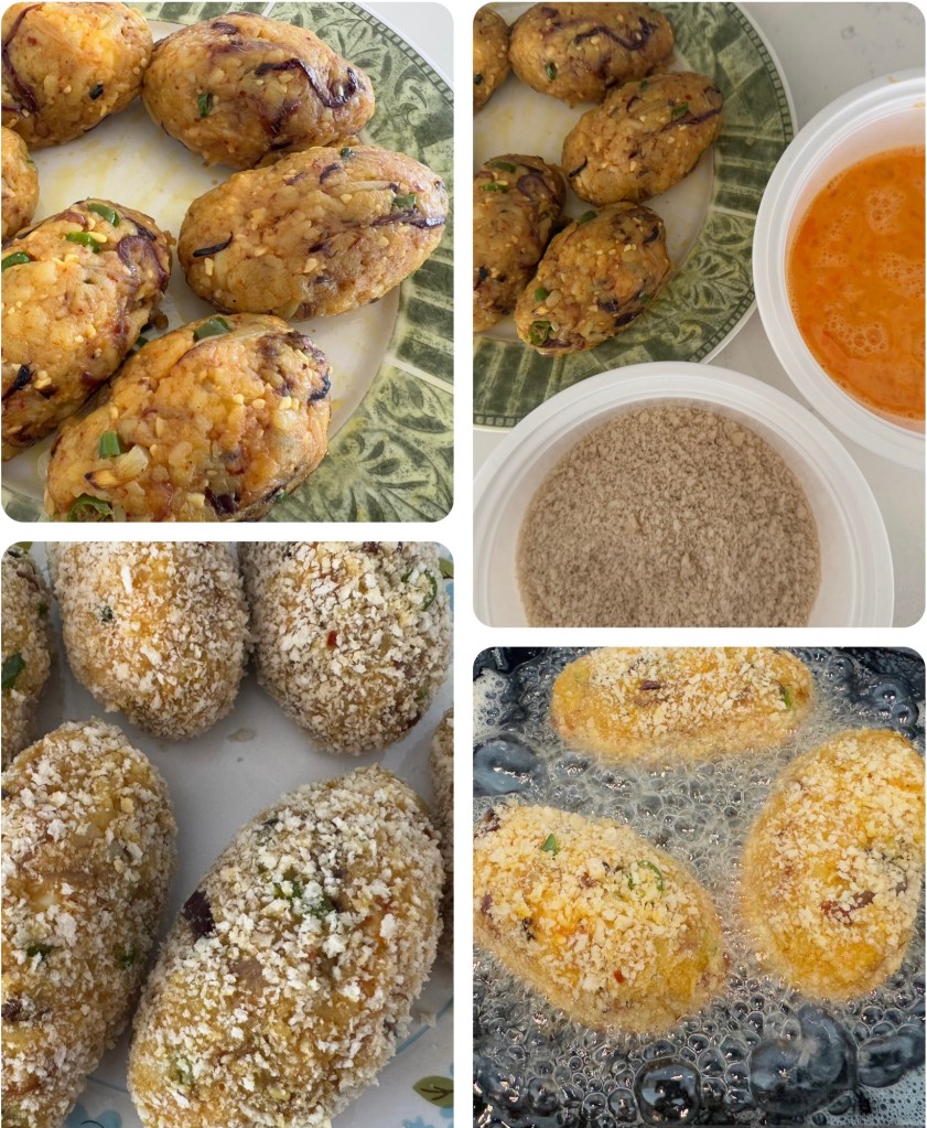 - Beat the two raw eggs in a bowl. Dip each potato-wrapped egg into the egg batter, then roll it in panko breadcrumbs for an even coating.
