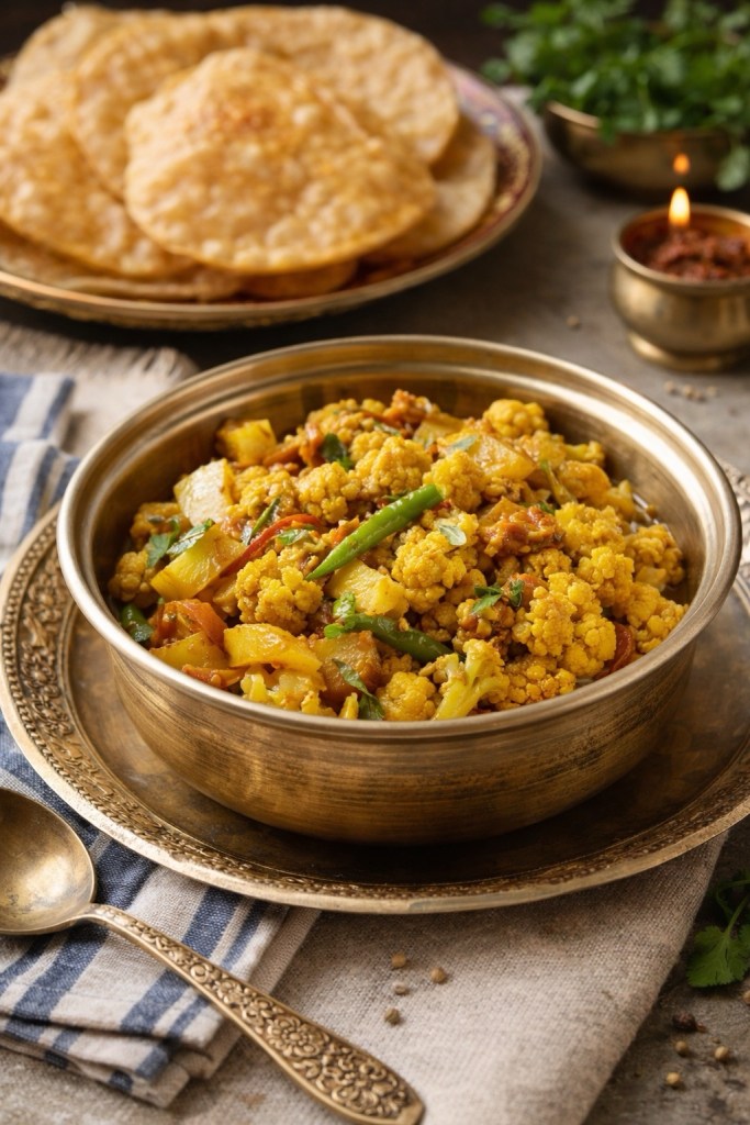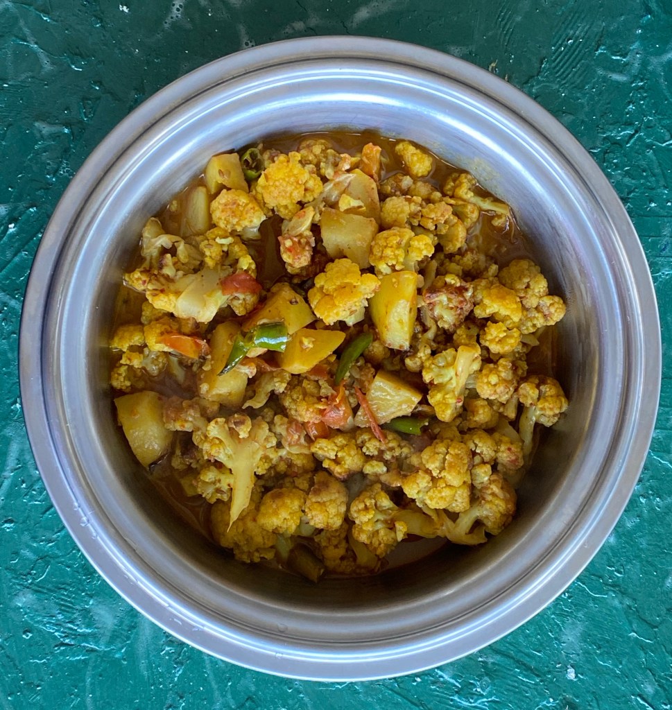 Phulkophir Niramish Dalna is a dish so familiar in a Bengali kitchen that its depth is often overlooked. ‘Niramish’ preparations, (vegetarian food) in a Bengali kitchen is shaped by ritual, season, and restraint. Made most often in winter, when cauliflower is dense and sweet, dalna is comfort food- a gently spiced gravy, and the unmistakable fragrance of Bengali whole garam masala blooming in mustard oil or ghee. The idea of niramish dalna emerges from Bengal’s Vaishnav and temple kitchens, where cooking without onion, garlic, or animal products wasn’t about lack, but about discipline – allowing vegetables and spices to speak without interference. When cauliflower arrived in Bengal during the colonial period, it fell in place in a Bengali kitchen easily, pairing naturally with potatoes, peas, and winter greens already central to the niramish repertoire. What distinguishes a dalna from preparations like ghonto or chorchori is its relationship with gravy. Dalna is neither dry nor soupy. The vegetables retain their structure as they are fried first and then simmered gently, where they take on the spices without losing form. In the case of cauliflower, the florets remain softened, but never collapsed.