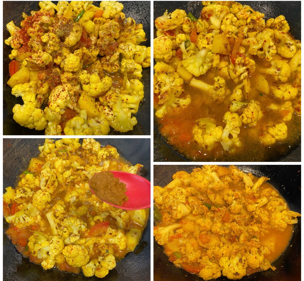 - Add ½ cup of water. Cover and cook till the vegetables are done. Do not overcook the cauliflower.