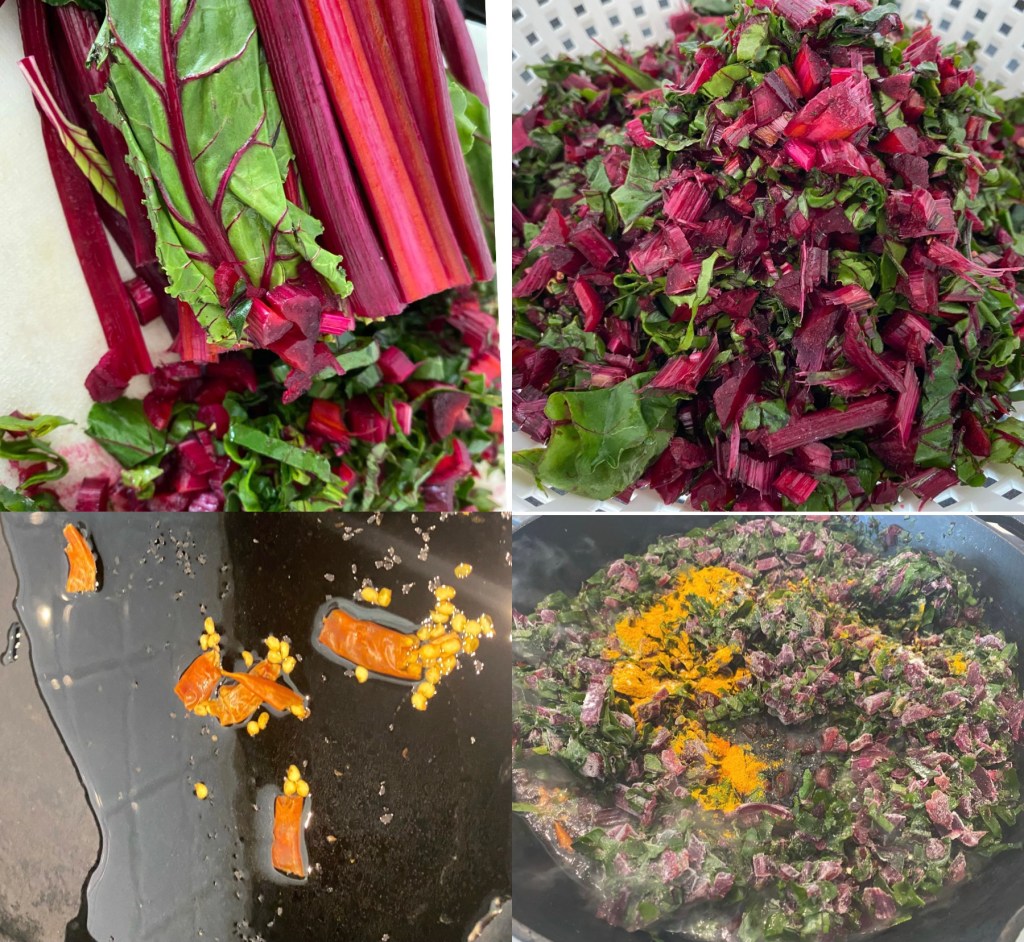 Chorchori is a traditional Bengali cooking technique rather than a single recipe. A dry, lightly mashed vegetable medley cooked slowly with minimal spices until the mixture becomes a cohesive whole, originates from the Bengali ethos of zero waste cooking. Beet greens, radish greens (mulo shaak), pumpkin leaves (kumro shaak) are all valuable seasonal produce. Here’s a humble Bengali classic cooking with greens that most people overlook, the perfect example of ‘kom moshla, beshi shad’ (less spice, more flavor). Beet Saag Chocchori is one of those understated Bengali dishes that proves greens do not need cream or complicated spices to taste good. This is a great way to use up the greens that come with the organic beets you buy from your local farmers market or grocery. The beet greens have a gentle mineral bitterness that mellows as they cook while still holding texture, the potatoes give it body, and mustard oil brings that unmistakable pungent depth. A touch of sugar rounds out the edges, and the slight thickening at the end makes the whole thing come together like it should -not watery, and not dry. Eating greens at the beginning of a meal gently prepares the palate and stomach. It pairs beautifully with hot steamed rice and a drizzle of ghee, letting the natural flavor of the greens shine without fuss or heaviness @sarchakra