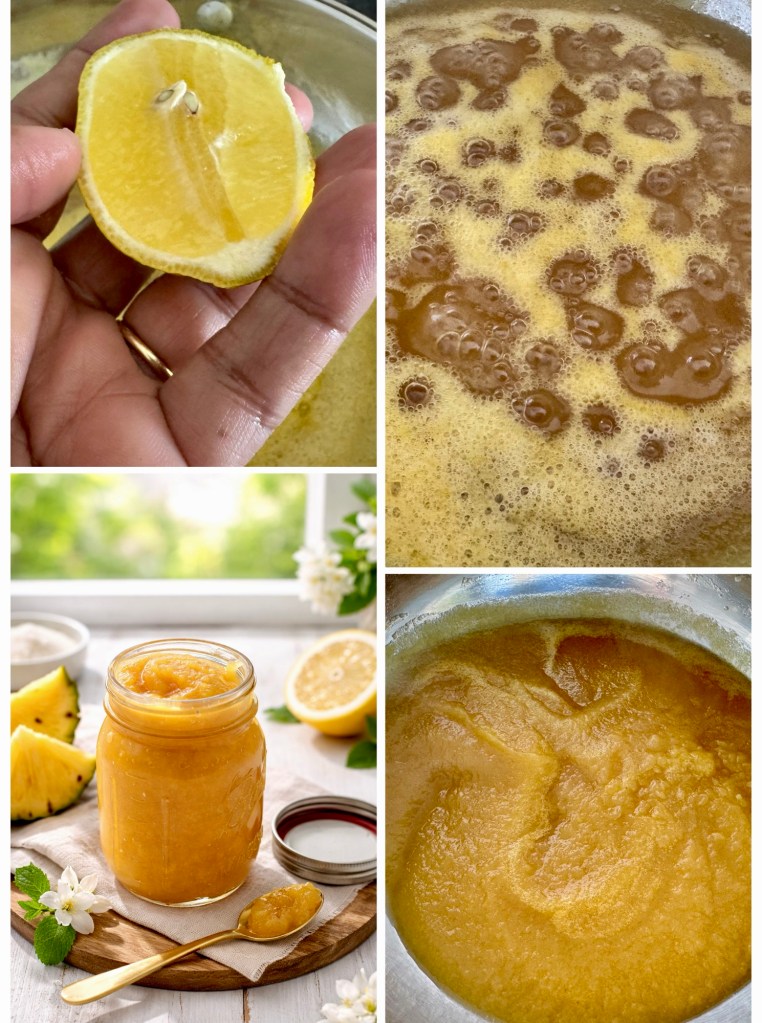 - Transfer the purée to a wide, heavy-bottomed pan. Add the lemon juice and sugar, then place over medium heat, allowing the sugar to melt gently into the fruit. Stir occasionally as the fruit releases its juices.